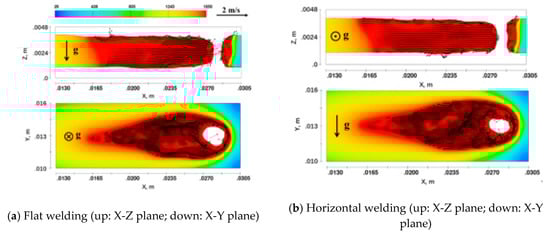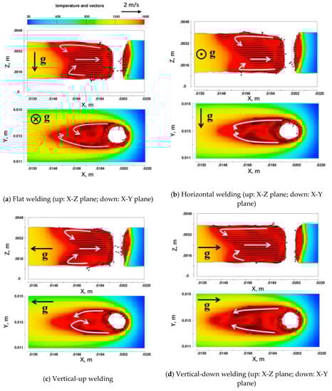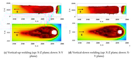 The temperature distributions and fluid flow velocities are shown in Figure 6 for the four welding positions and small heat input, after the full penetration has reached and the keyhole is at an open state. For each welding position, the top plot is for the center plane of a specimen (X–Z plane), and the bottom is for the plane parallel to and 0.5 mm below the top surface of the specimen (X–Y plane).