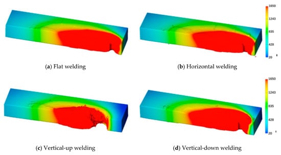 Similar flow patterns can be found for the other three welding positions. The shapes and dimensions of the weld pools are also quite close for different welding positions. Obviously, when the small heat input is used, the change of welding position, or the change of the orientation of the weld pool relative to that of gravity, will not notably affect the temperature and fluid flow fields of the laser weld pool. This finding is the same as that reported by Sohail el al. [] when they studied the influences of welding position in laser welding of steel. Such an irrelevance of welding positions to the weld pool behavior should also be attributed to the relatively small heat input used in their study.