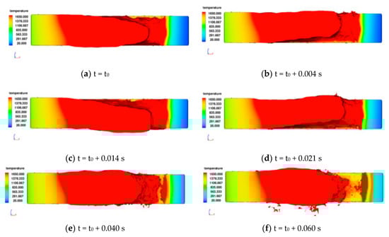 At a time step t0, the molten metal nearby the keyhole becomes thin under gravity action, while those at the rear part of the weld pool become thick. At time t0 + 0.004 s, the molten metal in the middle part of weld pool moves upward (in +Z direction) to a maximum height, which is 0.30 mm above the top surface of the workpiece, then begins to move downward (in the −Z direction). At t = t0 + 0.014 s, the molten metal moves to the maximum point in the opposite direction, which is 0.45 mm beyond the bottom surface of workpiece, and subsequently moves upward again. Clearly, oscillation of molten metal occurs in the thickness direction of workpiece, during which the molten metal nearby the keyhole may fly out of the weld pool, and result in mass loss. At time t0 + 0.04 s, a yellow part appears at the front surface of the keyhole, indicating no molten metal exists there due to the excessive backward movement and mass loss of molten metal. The area of unmelted metal is even larger at time of t0 + 0.06 s, indicating the molten metal flow is disrupted and no molten metal will continue to flow around the keyhole. In other words, a burn-through hole is formed.