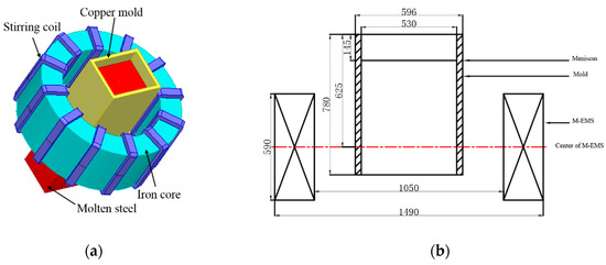 Ayata et al. [4] developed a new nozzle with an air-cooling system and EMS on the upper part of the nozzle to reduce the temperature of the molten steel. However, the space of the continuous casting platform limits the application of this technique. Yokoya et al. [5] applied swirling blades to the top of the single-port nozzle to form a horizontal swirling flow for the purposes of achieving superheat dissipation. Because the blade structure is complicated and easily washed away or eroded by liquid steel, which may lead to a nozzle block during service, the service life cannot be guaranteed. Sun et al. [6] compared the flow and solidification behavior of molten steel in different nozzle types, and found that the four-furcated tangential nozzle can produce a horizontal swirling flow of molten steel in the mold, obtaining a metallurgical effect similar to that of M-EMS. However, the higher manufacturing cost due to the complex structures is a factor limiting the wide application of this technology. Wang et al. [7] applied a 3D numerical model to analyze the molten steel flow with M-EMS for a round strand, in which the operational parameters for the current, frequency, and nozzle submerged depth were determined for an improved round strand quality. Yu and Zhu [8] simulated the flow field, the distribution of the temperature field, and the inclusion trajectory in the round billet, and conducted an industrial test to adjust the stirring parameters of the M-EMS, which significantly improved the shrinkage and surface defects of the strand. Li et al. [9,10] established a coupled model of electromagnetic, flow, heat transfer, and solidification under the low Reynolds number model of bloom casting. The electromagnetic field under different stirring parameters was revealed, and it was seen that increasing the current intensity will not only promote superheat dissipation, but also cause slow growth in the region of shell solidification. Sun and Zhang [11] established 3D and 2D hybrid models to simulate fluid flow and solute transport during the bloom casting under electromagnetic stirring. It was found that the solute enrichment of the molten steel caused positive segregation, and the washing effect caused by electromagnetic stirring caused negative segregation in the strand.