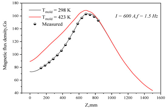 Figure 3 shows the magnetic flux density distribution along the casting direction of the central line of the strand at different mold copper temperatures (room temperature is 298 K; the on-line operation temperature is 423 K) when the current is 600 A and the frequency is 1.5 HZ. The magnetic flux density on the centerline of the mold was measured by a HT201 Gauss meter (HengTong Magnetoelectricity CO., LTD, SH, China) during two sequence casting intervals in production. It is evident that the model calculation results are in good agreement with the measured values when the temperature of copper tube is 298 K, which proves that the model is accurate and reliable. Considering that the copper tube temperature is higher and the conductivity is lower in actual production, the copper tube conductivity at 423 K is adopted for subsequent calculations.