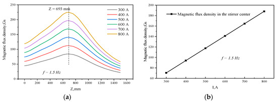 When the current frequency is 1.5 Hz, the magnetic flux density distribution on the central axis and at the center point of the stirrer at different current intensities are shown in Figure 4a,b, respectively. This indicates that, as the current intensity increases, the magnetic flux density at the same position increases significantly, and the maximum magnetic flux density appears when Z = 693 mm. When the current intensities are 300 A, 400 A, 500 A, 600 A, 700 A, and 800 A, the magnetic flux density in the center of stirrer is 70.5 Gs, 94.1 Gs, 117.6 Gs, 141.1 Gs, 164.6 Gs, and 188.1 Gs, respectively. Since the magnetically saturated effect of the iron core was not considered in the numerical model, the magnetic flux density at the center point is assumed to increase by 23.5 Gs, while the current intensity increased by 100 A.