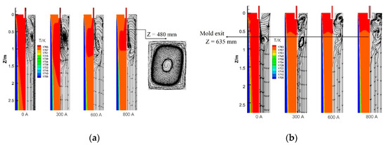 Figure 5 shows the flow streamline and temperature distribution over the wide symmetry plane (X = 0 m) of the two kinds of injection modes at different current intensities. After the M-EMS is applied, the rotating electromagnetic force causes a horizontal swirling flow, which prevents the downward movement of the liquid steel. A weaker secondary circulation flow is observed in the lower part of the mold, which will enhance with the increase of the current intensity. The increase of the current intensity is beneficial to the molten steel remaining in the upper recirculation zone. The five-port nozzle has an active upper recirculation zone thanks to the side holes’ jet flow, which is beneficial for the removal of bubbles and inclusions [17].