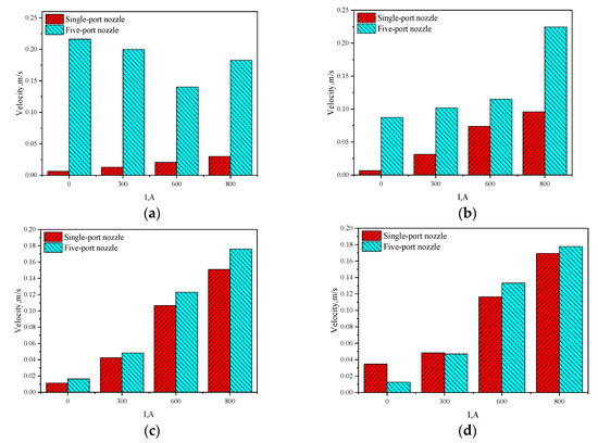 Figure 6 indicates the maximum velocity at the solidification front of each mold cross section of different current intensities. The washing effect of the molten steel at the solidification front helps to melt the frontier of the dendrite; then the broken dendrites will flow with the molten steel, which can enhance the nucleation of equiaxed crystals [18]. From Figure 6b–d, we see that, as the current intensities increase, the horizontal swirling flow generated increases as well, which results in an increase in the size of holes, due to the washing velocity of the solidification front. Figure 6a shows the jet flow zone of the side holes. As the current intensity increases to 600 A, the induced horizontal swirling flow can effectively slow down both the velocity at the port exit and the washing effect. However, when it is increased to 800 A, there appears to be an enhanced washing effect due to the excessive swirling flow. For the contribution of high outflow velocity from the side holes, the washing effect of the five-port nozzle on the solidification front is much more powerful than that of the single-port nozzle, which is favorable for generating free nucleation.