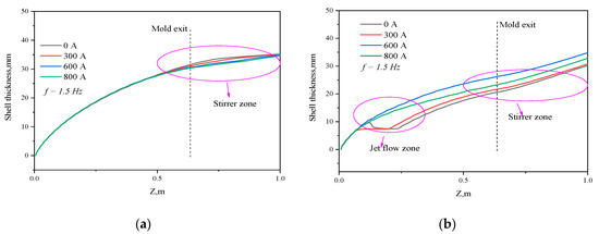 The distribution of the shell thickness calculated in the impact zone along the casting direction under the different current intensities of the two nozzle injection modes is shown in Figure 7, in which the solidification front is marked where the liquid fraction is 0.3 [19]. When the current intensities are 0 A, 300 A, 600 A, and 800 A, respectively, and a single-port nozzle has been installed, the shell thickness at the mold exit is 31.5 mm, 31.0 mm, 30.5 mm, and 30.4 mm, respectively. The horizontal swirling flow of molten steel created by M-EMS increases with the current intensity, which leads to a thinner growth of solidified shells near the mold exit. However, when the current intensities are the same as above but a five-port nozzle has been adopted, the shell thickness at the mold exit is 20.6 mm, 21.7 mm, 26.2 mm, and 23.3 mm, respectively. As the current intensity increases, the washing of the solidification front by the side hole jet flow initially decreases, but this is followed by an increase. That is to say that the re-melting phenomenon of the solidified shell disappears, and the shell of the stirring region slowly grows.