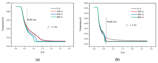The horizontal swirling flow caused by the rotating electromagnetic force can suppress the downward movement of molten steel from nozzle outlets, strengthen the horizontal heat transfer, and promote the superheat dissipation of the central molten steel [10]. The distribution of the temperature of the central molten steel along the casting direction of the two kinds of injection modes under different stirring current intensities is shown in Figure 8. For the cases with a single-port nozzle, when the stirring current intensities are 0 A, 300 A, 600 A, and 800 A, respectively, the superheat degree of the molten steel at the exit of the mold is 8.2 K, 7.7 K, 6.8 K, and 6.3 K, respectively. However, when the current intensities are the same as above but a five-port nozzle is adopted, the superheat degree of the molten steel at the exit of the mold is 3.1 K, 0 K, −0.5 K, and −0.6 K, respectively. Although the original superheating degree of molten steel of the five-port nozzle is higher than that of the single-port nozzle injection mode, the molten steel in the side holes can directly impact the initial solidified shell and forcibly exchange heat with it, resulting in extremely rapid superheat dissipation. Together with M-EMS, the five-port nozzle puts the molten steel at the exit of the mold in a supercooling state, which is favorable for the formation of the central equiaxed crystal.