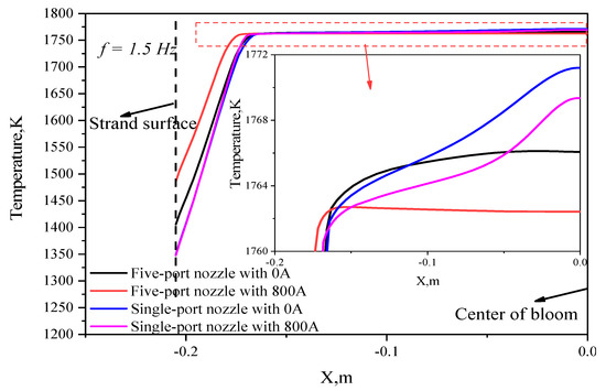 Figure 9 shows the temperature distribution in the exit section of the mold along the X direction under different stirring current intensities for the two injection modes. From the center to the surface of the strand, the temperature of the molten steel changes very slowly at first, followed by a rapid decrease in both cases. However, the surface temperature of the strand is significantly higher when the injection is made through a five-port nozzle than through a single-port nozzle. In the five-port nozzle injection mode, when we set the current intensity to 0 A, 300 A, 600 A, and 800 A, respectively, the strand surface temperatures were 1405.4 K, 1416.0 K, 1427.7 K, and 1485.8 K, respectively, and the temperature gradient from the surface to the center of the strand was 1.76 K/mm, 1.74 K/mm, 1.63 K/mm, and 1.35 K/mm, respectively. This can be defined as follows: