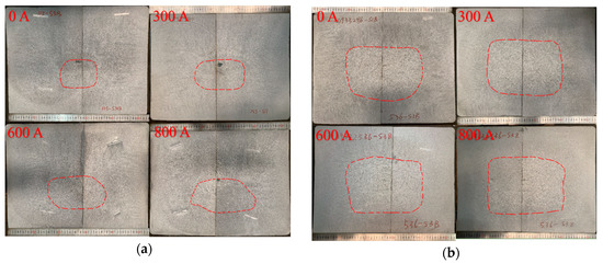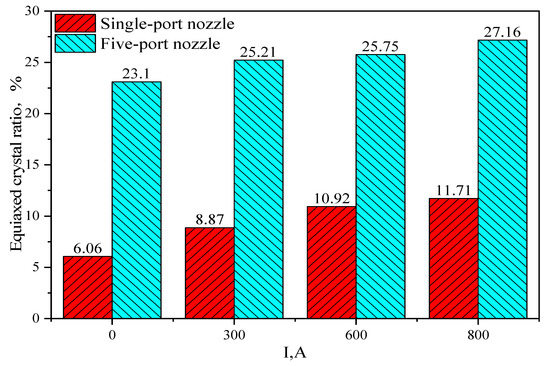 Cross-sectional macroscopic images with different stirring current intensities and the two nozzle injection modes are given in Figure 10a,b. It is clear that the central shrinkage cavity defect of the strand is severe under the single-port nozzle injection mode, but much improved with the five-port nozzle injection mode. The red dashed line signifies the front of the columnar crystal. Figure 11 shows the equiaxed crystal ratio in the two injection modes, respectively. When the current intensity is increased from 0 A to 800 A, the equiaxed crystal ratio increases from 23.1% to 27.15% for the five-port nozzle injection mode, but only increases from 6.06% to 11.71% for the single-port nozzle injection mode. In addition, the equiaxed crystal ratio increases with the current intensity for both modes, but a much larger increase has been observed for the mode with a five-port nozzle.