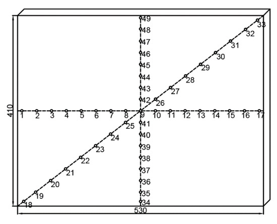 The chemistry sampling for the strand after the pickling test under the conditions of 800 A was carried out by using a 5-mm-diameter drill up to a depth of 8 mm for the two injection modes. We divided the strand into 16 parts along three directions in its cross section; a total of 49 test samples were taken, as shown in Figure 12, and the carbon content was measured by a carbon sulfur analyzer.