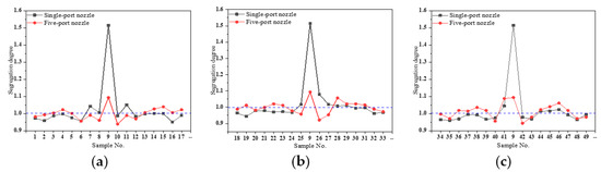 Figure 13 displays the segregation degree of carbon elements at the sampling point of the strand. The columnar crystals under the single-port nozzle cause serious central shrinkage and center segregation, but the carbon content distribution is uniform on the columnar crystal branches. For the five-port nozzle injection mode, however, there is a much larger equiaxed crystal ratio, together with improved central shrinkage. The enrichment of solutes at the frontier of columnar crystal growth leads to the severe centerline segregation, while the equiaxed crystal is beneficial for the distribution of the solutes, which results in a significant improvement of the central segregation. When the columnar crystal front meets the equiaxed crystal ahead, it will produce an enriched solute area called the CET zone [20]. For special steels, the factual carbon content range or the difference between the maximum and minimum values in the as-cast strand is an important index to evaluate the carbon segregation control. The carbon content range in the strand with single-port and five-port injection is 0.279% and 0.080%, respectively, which indicates that the combined application of the five-port nozzle and a current intensity of 800 A has a positive effect on the chemistry homogenization of the large bloom casting.