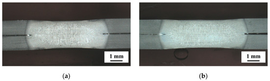 The tensile test, microhardness test, and fatigue test were carried out to evaluate the mechanical properties of the weld. The strain rate used in the tensile test (AG-300kNX Plus, Shimadzu, Kyoto, Japan) was set at 10 mm/min according to the standards of the American Welding Society (AWS D8.9M:2012) [17]. The hardness of the welds was measured using micro Vickers hardness tester (HM-101, Mitutoyo, Kawasaki, Japan) and the indentation load used was 200 g. Fatigue tests were performed using a fatigue testing instrument (Instron 8801, Instron, Norwood, MA, USA) with a 5-ton capacity. To ensure reliability, the fatigue test was conducted twice for each fatigue load and sample. When the fatigue test was carried out, a 30 mm × 30 mm shim was attached to both sides to prevent the moment applied to the weld (Figure 1b). The frequency was set to 40 Hz and the stress ratio between minimum and maximum load (R = Lmin/Lmax) was set to 0.1. The fatigue life was measured by controlling the maximum load (Lmax) at intervals of 1 kN from 8 kN to 1 kN, and the fatigue limit was set to 2 × 106 cycles.