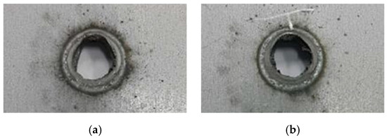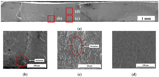 Figure 12 shows the fracture surface when a plug failure occurs. Figure 12a shows a relatively ductile fracture surface compared to the pull-out failure. In Figure 12b, where cracks were initiated, there is the inclusion at the interface. On the basis of the inclusions, the left part has striations with upward cracks and the cleavage fracture to the right. The striations at the area near the crack initiation were extended upward (Figure 12c) and the striations at the crack propagating region (Figure 12d) were also all extended upward. The degree of striations at the edges was reduced. This is because the plug failure tears the BM at the edge when the nugget is ripped from the center. This is because the plug failure mode tears the nugget at the center and tears the BM at the edge.