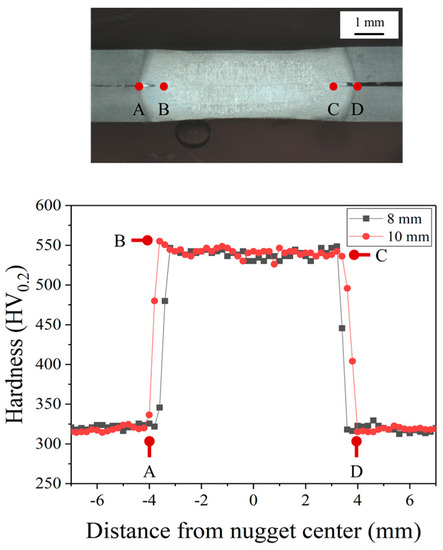 Figure 2 shows the cross section of the weld when the electrode face diameter is 8 and 10 mm, respectively. As shown in Table 4, the nugget sizes were 5.1 and 5.7 mm, respectively, and the tensile shear strengths were 12.5 and 15.5 kN, respectively. Nugget size and tensile shear strength at the electrode face diameter of 10 mm were higher than those of electrode face diameter of 8 mm. Tension shear test results showed pull-out failure at both electrode face diameters of 8 mm and 10 mm (Table 4), and the fracture shape is shown in Figure 3. Figure 4 shows the results of hardness measurements of welds according to the size of the electrode face diameter. The average hardness of the base metal (BM) was 320, 318 HV0.2 and the hardness of the fusion zone (FZ) was 539 and 542 HV0.2, respectively, depending on the type of electrode face diameter. There was no significant difference in the hardness of the welds due to the difference of size in electrode face diameter. Since the austenite was transformed into martensite as the molten metal was cooled at a rate of 10–104 °C/s due to the cooling water flowing through the electrode during the resistance spot welding process, the hardness of the FZ was drastically increased [18,19] as compared with base metal. Hardness in HAZ was higher than BM and lower than FZ. It has been reported that the softening phenomenon occurs in HAZ when hardness is lower than BM in DP980, Q & P980, B1500HS, etc. [16,20,21]. In the presence of martensite in the BM, HAZ softening phenomena are observed by sub-critical HAZ (SCHAZ) with tempered martensite, inter-critical HAZ (ICHAZ) with ferrite and martensite, and upper-critical HAZ (UCHAZ) with the coarse grain [22]. In this study, HAZ softening did not occur because there was no martensite in the BM.