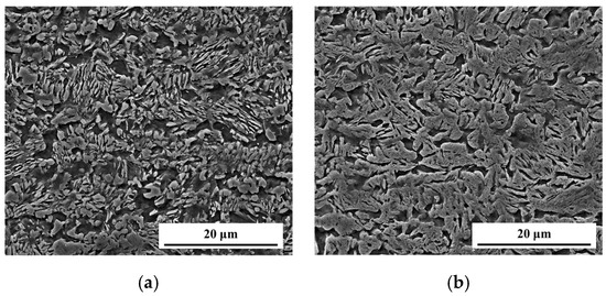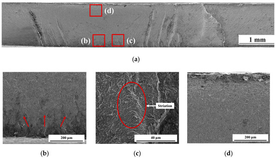 The fatigue test was stopped when the fracture occurred or fatigue limit was reached. The specimens were cut in the width direction and observed with a scanning electron microscope (SEM, Quanta 200F, Thermo Fisher, Waltham, MA, USA) to observe the microstructure of the fatigue fracture after the fatigue test.
