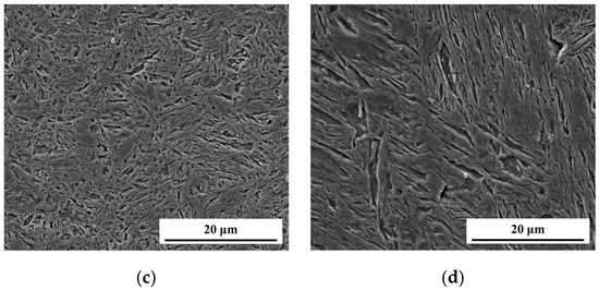 Figure 5 shows the microstructure of the base material, HAZ, and FZ. In general, the microstructure of TRIP steel consists of ferrite, bainite, retained austenite, and a small portion of martensite [23]. As shown in Figure 5a, the base material of 980 MPa grade TRIP steel used in this study is composed of ferrite and elongated bainite. Due to the combination of these microstructures, the hardness of the BM was approximately 320 HV. HAZ is divided into two areas, which are SCHAZ near BM and UCHAZ near FZ. The microstructure of SCHAZ was tempered by the bainite present in the BM (Figure 5b) because the peak temperature reached a temperature below Ac3. Since UCHAZ reaches the peak temperature above Ac3, ferrite and bainite of the base material are transformed into austenite. Then, due to the high cooling rate, the microstructure is composed of martensite, ferrite, and bainite (Figure 5c) [24]. FZ is completely melted and transformed into austenite. Thereafter, the microstructure was composed of two phases of martensite and bainite (Figure 5d) due to the high cooling rate during cooling, and the hardness of FZ was about 540 HV.