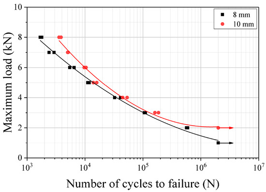 Figure 6 shows the load-number of cycles to failure curves of the resistance spot welding specimen obtained by fatigue test using two kinds of electrodes. In both face diameter conditions (8 mm and 10 mm), fatigue life decreased as the fatigue load increased. For the electrode face diameters of 8 mm and 10 mm, the fatigue limit of 2 × 106 cycles was reached when the fatigue loads were 1 kN and 2 kN, respectively. The fatigue life of the electrode face diameter of 10 mm was longer than that of 8 mm. When the fatigue load was 5–8 kN, the fatigue life of the 10 mm electrode was about two times longer, and the fatigue life difference was decreased at the lower load. In this study, the fatigue life was increased when the nugget size was large. As the nugget size of the resistance spot weld increases, the joint area increases and the stress concentration decreases [25].