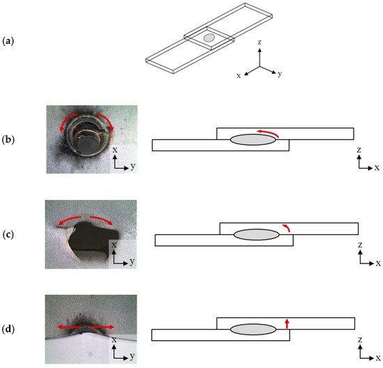 The red arrows of OM images in the XY plane and of schematic diagram in the XZ plane indicate the cross-sectional direction of the crack propagation. Pull-out failure is a failure mode in which the crack propagates around the nugget, and the nugget is completely pulled out from the base material and the HAZ (Figure 8a and Figure 9b). In contrast, the crack in HAZ failure mode propagates in a direction perpendicular to the load (Figure 8c). The crack propagation in Figure 9d spreads to the base material outside the nugget than the propagation direction of the pull-out failure and propagates in the thickness (Z-direction). The plug failure is a failure mode in which the pull-out failure and the HAZ failure are mixed. The crack spreads about 30% over the entire circumference of the nugget and propagates in the direction perpendicular to the load (Figure 8b). The propagation direction of the plug failure is similar to that of the pull-out failure, but the crack propagates in the HAZ region, which is slightly further from the nugget (Figure 9c).