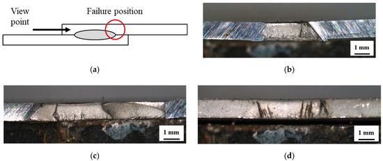 As shown in Figure 10, in order to observe the initiation and propagation of fatigue cracks, the specimen of Figure 8 was cut and observed with OM. Figure 10a shows the viewpoint direction and failure position. The location indicated by the red circle is a notch where stress concentration occurs due to thermal cycling during resistance spot welding, and necking occurs when a tensile load is applied [14,15]. Therefore, a crack was generated and propagated in the notch. As shown in the fracture surface of the pull-out failure (Figure 10b), the nugget was broken and the plug failure and HAZ failure occurred due to the propagation of the crack to the base material (Figure 10c,d). Therefore, the area of the fracture surface increased in the order of pull-out, plug, and HAZ failure. Pull-out failure and plug failure have a shape in which the cracks gather from outside to inside, because the crack propagates around the circumference of the nugget when first propagated, and HAZ failure spreads from the inside to the outside.