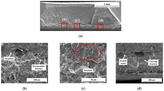 Figure 11, Figure 12 and Figure 13 show the result of observing the fracture surface using SEM. Figure 11 shows the fracture profile when the pull-out failure occurs. Figure 11a shows the brittle surface as a whole, and intergranular fracture occurred at the interface between the material and the material. When the location of the intergranular fracture was observed at high magnification (Figure 11b), intergranular fracture and dimple occurred from the bottom to the middle, and striations occurred due to the fatigue crack progression at the upper part. At this time, since the direction perpendicular to the direction of the striation is the direction of crack propagation, it can be seen that the cracks have propagated upward (Figure 11c). As shown in Figure 11d, similar to Figure 11b, there is an intergranular fracture in the lower part, and striation, second crack, and cleavage fracture were observed. When a tensile load is applied, fracture occurs at the grain boundary where the bonding force between atoms is weakest, and phenomena such as cleavage fracture and slip occur [27]. Therefore, cracks initiated at the lower end of the fracture surface where the intergranular fracture occurred, and the intergranular fracture occurred in the wide area of the lower part, and the crack was initiated in multiple.
