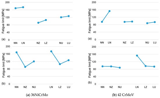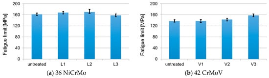 At the state of the present work, the deep rolling optimization was then performed with regard to the load that was applied by the rollers for the two sets of investigated materials (and screw geometries). The untreated condition (as-turned for 42CrMoV, as-ground for 36NiCrMo) was included in the experimental campaign. Four levels of load were evaluated: untreated, L1, L2 (35% greater than L1), and L3 (70% greater than L1) for 36NiCrMo and untreated, V1, V2 (10% greater than V1), and V3 (45% greater than V1) for 42CrMoV, L1, and V1 representing the rolling loads commonly applied by the fastener manufacturer (load values are omitted for confidential reasons). The results have been determined in terms of fatigue limits and they are shown in Figure 2.