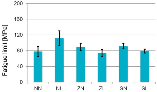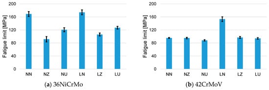 The results in terms of the fatigue limits for the two screw materials, 36NiCrMo and 42CrMoV, are collected in the bar graph in Figure 3, where the letters in the horizontal axis correspond to the treatment combinations in Table 1. Confidence bands at the 95.5% confidence level are also included.
