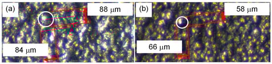 The presence of interaction indicates that the outcomes of the aforementioned ANOVA are not completely reliable: they may reasonably be used for data analysis at a first glance only, highlighting the presence of interaction at the same time. The analysis has been moved from statistics to microscope observations in order to overcome this issue. In particular, the fatigue results and the detrimental effect of shot-peening have been then addressed in the light of some observations of the treated surface at the shank. Roughness (Ra) measurements have also been run. Observations were performed by a stereo-microscope (Stemi 305; ZEISS, Oberkochen, Germany) with subsequent surface morphology acquisition. On the other hand, roughness measurements by a roughness tester (INTER.RT25P; Alpa, Pontoglio, Brescia, Italy) made it possible to compare the Ra values in the cases of turned and of peened surfaces. Following calibration, the captured microscope images have also been post-processed to estimate the size of the dimples that were generated by the two different peening treatments. Some examples of surfaces are shown in Figure 5 with regard to the combinations “NN” (untreated), “NZ” (Z100), and “NU” (UFS70) of the second material. A few details of the measured dimples for “NZ” and “NU” treatments, respectively, are provided in Figure 6. It can be observed that both the surfaces appear to be significantly pitted, as a result of the 200% coverage. Image post-processing indicates that the dimple average diametral size is 85 μm for NZ and 60 μm for NU. When considering that the dimple width is proportionally related to the size of the impacting shots [], the morphology of these dimples indicates the deep and remarkably strong impact of a large amount of particularly small sized shots, especially for the UFS70 treatment.