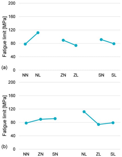 The output variable was the fatigue limit, while considering a run-out value of 2 x 106 cycles, meaning that, when failure did not occur before, the test was stopped after two million cycles and a not failure outcome was assumed for further processing. When considering steel materials, run-outs in the range between 106 and 107 cycles are usually presumed, as they correspond to the number of cycles at the fatigue limit []. At a first stage, some preliminary fatigue tests were carried out, while considering a run-out corresponding to 107 cycles. Based on the outcome that no failures occurred after one million cycles, the aforementioned value for run-out was considered, also accounting for an extra life span. The experimental results were processed according to the recommendations of ISO 12107 [] and of the Dixon method [] for the implementation of an abbreviated staircase sequence that aimed at the estimation of the fatigue limit for infinite life, based on the sequence of failure and not failure events. Sequences consisting of eight nominal specimens (at an average) were considered for each treatment combination in Table 1. In agreement with the aforementioned references, stress steps in the order of the 5% of the fatigue limit and of its standard deviation were considered. The starting point of the sequence was roughly estimated by some exploratory tests in the finite life domain.