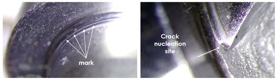 A further possible source for this outcome could be related to some slight deviations of the rolls from their path operating at the fillet upon deep rolling, due to some surface irregularities, namely the dimples, which are induced by shot-peening. These deviations are likely to induce some marks that might trigger microcracks and then failure (Figure 9).