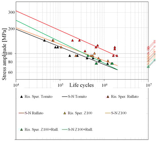 The aforementioned remarks, dealing with fatigue in the infinite life domain, are confirmed by the fatigue responses for finite life. As a first remark, the improvement yielded by the quadratic model always proved to be not significant, so that the linear model was regarded as the most suitable. The S-N curves for the NN, NL, ZN, and ZL treatments are plotted together in Figure 10; run-out events, with several overlapped points, are also present and highlighted by arrows. The curves for SN and SL combinations are omitted here for the sake of synthesis, when considering that the fatigue strengths of the two peening treatments, with and without deep rolling, are well aligned.