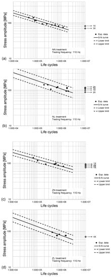 S-N curves in the finite life domain sketched along with their confidence bands for (a) NN, (b) NL, (c) ZN and (d) ZL treatments of the second fatigue campaign.