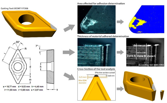 Some of the machining conditions were specifically studied by obtaining the cross-section of the tool (Figure 2). The tool was cut using a wire electro discharge machine ONA PRIMA E25 (ONA, Durango, Spain). Then, the sections were slightly ground and studied in a Nikon Epiphot 200 metallographic microscope (Nikon, Tokyo, Japan). Scanning electron microscopy (SEM) and energy dispersive spectroscopy (EDS) were used in order to characterize the section and the entire tool. For this purpose, a FEI QUANTA 200 microscope (ThermoFisher Scientific, Hillsboro, OR, USA) was used with an EDAX Phoenix system (Phoenix, EDAX, Mahwah, NJ, USA). Finally, the surface finish of the part was measured in terms of average roughness values (Ra) with a Mahr Perthometer M1 roughness measure station (Mahr Metrology, Göttingen, Germany).