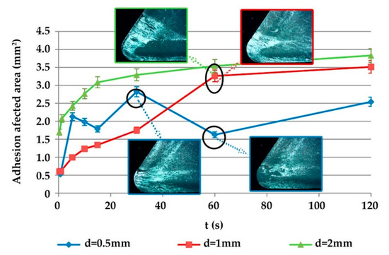 Secondary adhesion affected area as a function of cutting time.