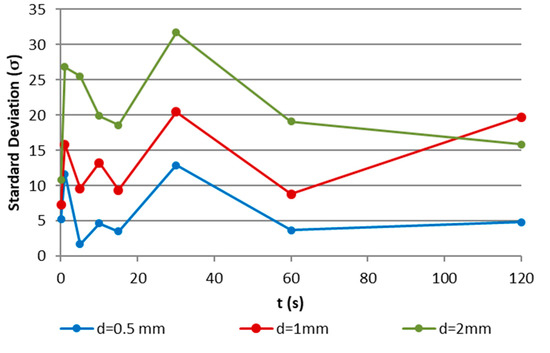 However, this analysis showed a high variability on the morphology of the material adhered to the cutting edge, which could be related to the changes produced in the force density in the lateral part of the chip fluency. This variability suggested the study of alternative statistical parameters to the average value. For this reason, the standard deviation of the thickness data at each edge was studied, showing a repetitive pattern for the entire cutting depth (Figure 7). This fact proved that the dynamic behavior of the adhesion is more repetitive than expected, and it could be normalized for different cutting depths (d).