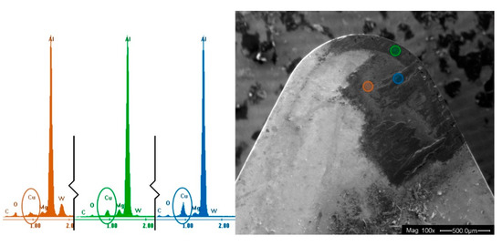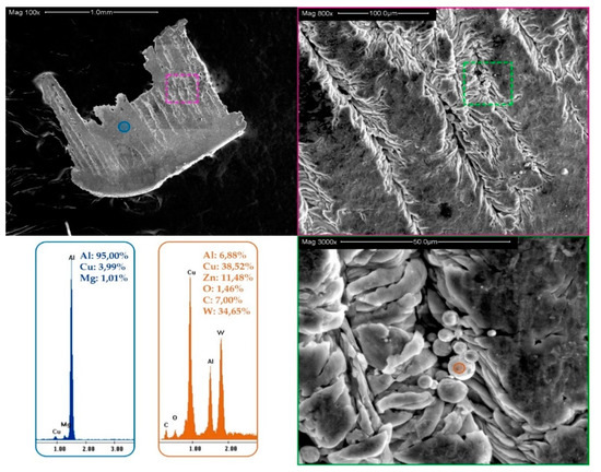 As can be observed in Figure 10, there is a fracture in the area close to the cutting edge; there was a non-uniform detachment during machining. On the other side (reverse, Figure 11), there are cracking morphologies in the direction of the chip fluency. These may be produced by the temperature changes during the chip extrusion and the MBUL deposition. The EDS analysis shows the composition close to the aluminum alloy, suggesting that the first layer responsible for the appearance of marks on the chip (primary BUL) does not easily detach. Additionally, the crack on the MBUL surface generally contains small spheres, with W and Cu as the main components. The spheres seem to be part of the intermetallic alloy mixed with tool particles, which could cause synergistic behavior between the two main wear mechanisms: adhesion and abrasion.
