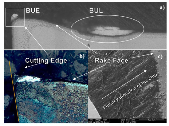 This stratification is given on the rake face following the chip fluency direction (Figure 9c). The cross-section shows how the different layers of material overlap until the chip breaker is filled (Figure 9a). This material looks to be distributed unevenly around the edge of the tool, creating a BUE, and forming a MBUL over the rake face, where it is possible to identify the interface between the layers. In this case, the friction is completely different, being Al–Al instead of Al–WC-Co. This fact could also vary the output of the chip [12].