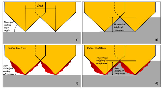 Tool wear effect on the surface roughness. (a) Initial cutting scheme. (b) Theoretical height of roughness during the machining process. (c) Cutting scheme with adhesion wear effects. (d) Reduction on roughness due to adhesion in flank face.