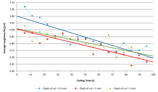 The instantaneous formation of the adhered material changes the tool geometry and frictional behavior, favoring tool wear. As the secondary adhesion occurred during the machining time (Figure 12c), the main angle position of the cutting edge is modified [3,8,16], leading to a variation of the Ra [11,28,29]. In the case of aluminum alloys, Ra can decrease with the machined length; that is to say, the surface integrity improves as the machining time increases (Figure 13). However, this decrease was accompanied by strong oscillations, caused by the cyclic adhesion and drag process explained above.