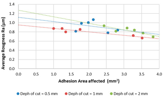 Evolution of Ra as a function of the area affected by adhesion, for each depth of cut. Dotted lines represent linear trends.