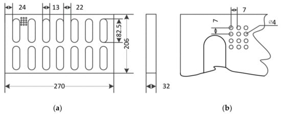 Dimension and hole layout of the CGI plate (Unit: mm). (a) The dimension of the CGI plates, and (b) holes layout.