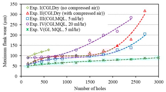 From Figure 4, we know that the tool wear in Experiment I increases linearly with the number of holes before the drill is broken. In Experiment II and III, the process of tool wear can be divided into three phases: break in the period (0–900 holes), steady state wear region (90–2100 holes), and failure region (2101-drill broken). The tool life in the first four experiments is 639 holes, 2969 holes, 2948 holes, and 2685 holes, respectively. The tool life in Experiment I is the shortest. This is because, in Experiment I, there is no lubrication and the maximum flank wear is higher than those in Experiments II–IV. Furthermore, in the first 1800 holes in Experiment II and Experiment III, the flank wear of the latter is slightly lower than the former. After that, the differences of flank wears in these two experiments grow bigger. These differences indicate that, when applying the MQL (5 mL/h), the lubrication condition has been improved and the wear has been reduced. However, if the spray speed of MQL changes to 20 mL/h, the friction between the tool and the workpiece cannot be improved. As shown in Figure 4, the maximum flank wear and wear rate in Experiment IV is higher than that in Experiments II and III. The mixture of oil and dust chips in Experiment IV is difficult to eject, which causes higher tool wear. In conclusion, the good chip evacuation and the lubrication of the oil could lead to the lowest tool wear (Experiment III).