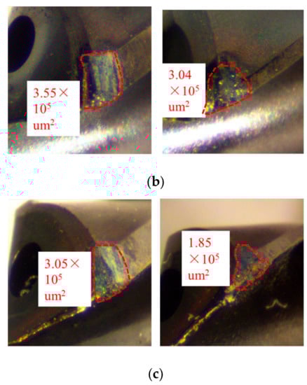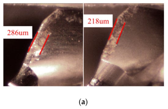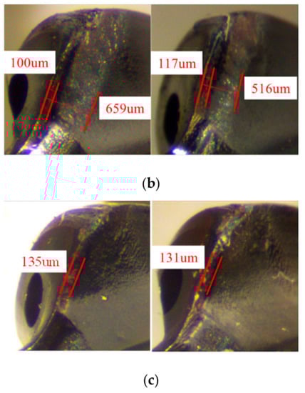 The flank wears of three worn drills: (a) Experiment I (600th hole), (b) Experiment II (2700th hole), and (c) Experiment III (2700th hole). Reproduced from [], with permission from Taylor & Francis.