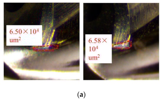 The margin wears of three worn drills, which occur on the outer corner of the cutting edges, are demonstrated in Figure 7. The area of the margin is used to evaluate the level of the margin wear. At the margin region, the peripheral speed is the highest. Increasing the cutting speed could increase the cutting temperature, which further causes the hardness of the drill material to drop. As a result, the main wears are abrasion, thermal softening, and diffusion in the margin region. Thermal softening not only leads to the increased abrasive wear, but also results in plastic deformation of the cutting edges. The latter would further aggravate the drill abrasion. After drilling 600 holes in Experiment I, the wear area of the two margins are 6.5 × 104 and 6.58 × 104 um2, respectively. Apart from the heat effect zone in Experiment I, the chipping and abrasion can be clearly seen in the margin of the drill in both Experiment II and Experiment III. Compared with the margin wears in the other two experiments, the wear areas of two margins in Experiment II (3.55 × 105 and 3.04 × 105 um2) are larger.
