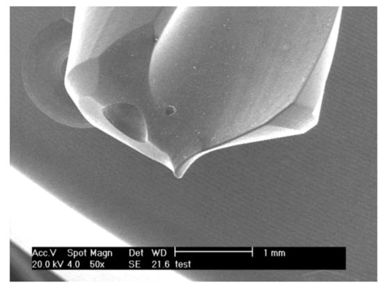 The rake face of the drill contacts the chip in the drilling process. The diffusion and adhesion can easily come up in these zones due to the high contact pressure. The SEM picture of the new drill is shown in Figure 8. In the present work, the worn drills after 900 holes were selected for SEM and for the analysis of the elements at the cutting edge using EDS. The rake face SEM pictures of the worn drill in Experiment II is shown in Figure 9.