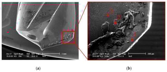 The SEM pictures for the worn drill after 900 holes in Experiment II: (a) SEM picture, and (b) SEM picture for EDS.