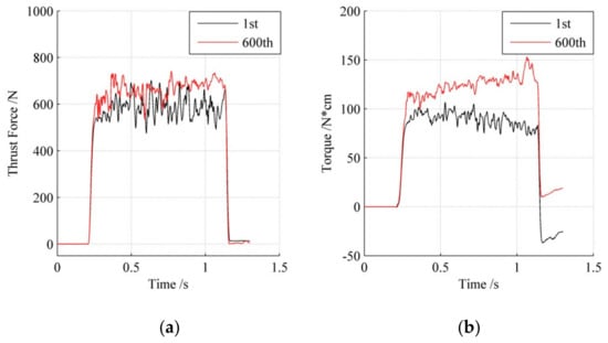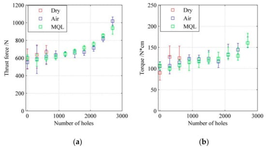 Being affected by the chips in the holes, the cutting loads are unstable in Experiment I, as shown in Figure 12a,b. With the increase of holes, the tool wear is getting worse and worse. The torque and the thrust force are increased as well. After drilling 600 holes, the fluctuations of the lines are reduced, which means the thrust force becomes more stable. In addition, the thrust force at a specific hole does not change greatly with the drilling depth. However, by contrast, it is clear that the torque is changing (increasing at the beginning and decreasing at 600 holes) when the tool is drilling through a hole.