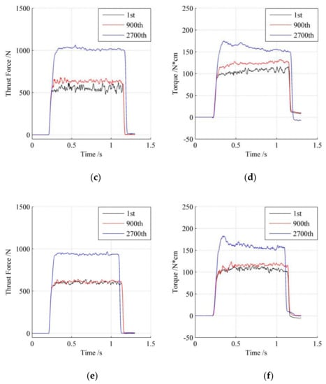 The cutting loads of three Experiments at different holes: (a) Thrust forces in Experiment I, (b) torques in Experiment I, (c) thrust forces in Experiment II, (d) and torques in Experiment II. (e) Thrust forces in Experiment III, and (f) torques in Experiment III. Reproduced from [], with permission from Taylor & Francis.
