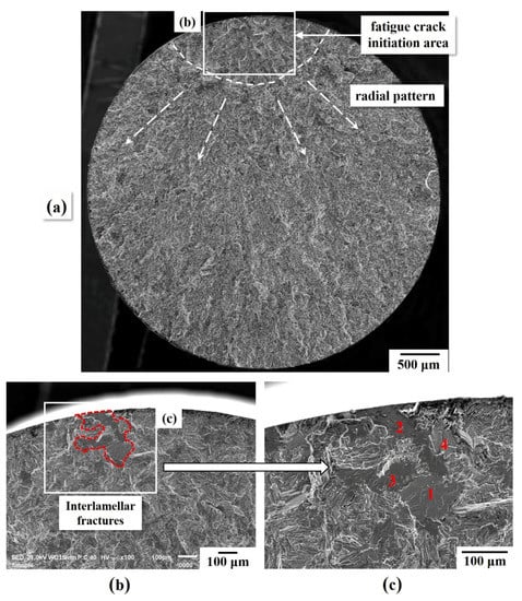 RC4 was tested with an R ratio of 0.5. SEM images show (a) general morphology of fracture surface, (b) coalescent interlamellar fractures indicated by red dashed lines in the fatigue crack initiation area and (c) details of coalescent interlamellar fractures. The four connected interlamellar facets at different angles are indicated by red numbers.