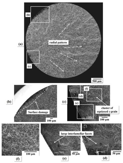 At R = 0.1, in the crack initiation area, a cluster of three to four conjoined interlamellar fractures (~80–100 μm in diameter) of similar orientations were found in RC1 (Figure 3b). RC2 failed as a result of multiple crack sources including surface damage (Figure 4b) and large interlamellar fractures (Figure 4d,e). It is worth noting that in the crack initiation site “d”, a cluster of equiaxed γ-grain was observed ahead of the crack growth path. Equiaxed γ grains are reported to be less resistant to crack growth compared to the lamellar structure [,], which can further favour the crack propagation from the site “d”.