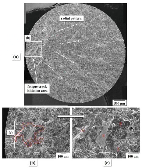 The fracture surfaces were carefully evaluated with SEM to find crack initiation areas. Normally, the fatigue crack area may be identified via the following microscopic or macroscopic features []: