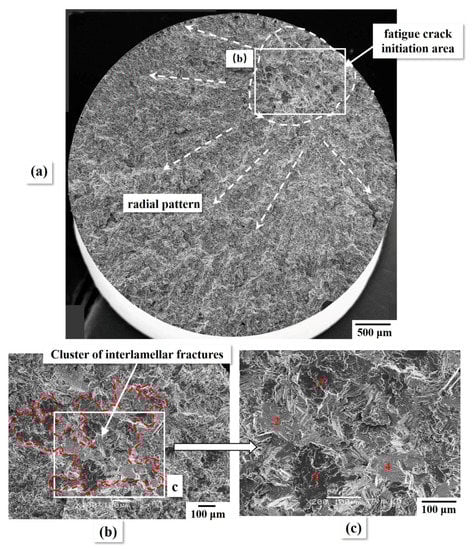 RC3 was tested with an R ratio of 0.5. SEM images show (a) general morphology of fracture surface, (b) coalescent interlamellar fractures indicated by red dashed lines in the fatigue crack initiation area and (c) details of coalescent interlamellar fractures. The four connected interlamellar facets at different angles are indicated by red numbers.